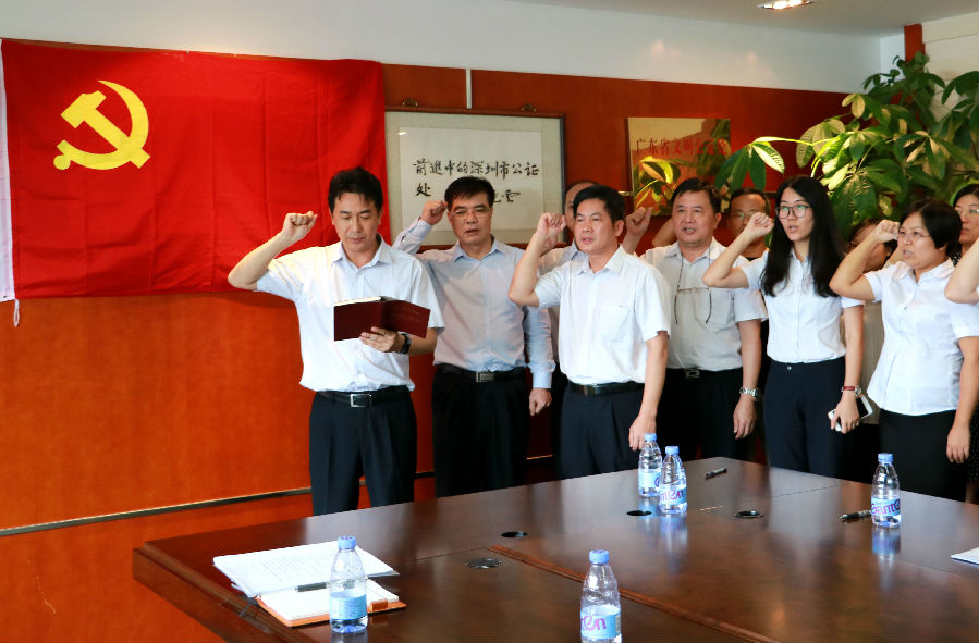 7月20日下午5:30,深圳公证处开展党员“重温入党誓词、不忘初心、继续前进”主题活动,党委书记杨少彬、党委副书记、纪委书记曾小渊和各基层党支部书记、副书记及委员、党员代表参加了活动。
