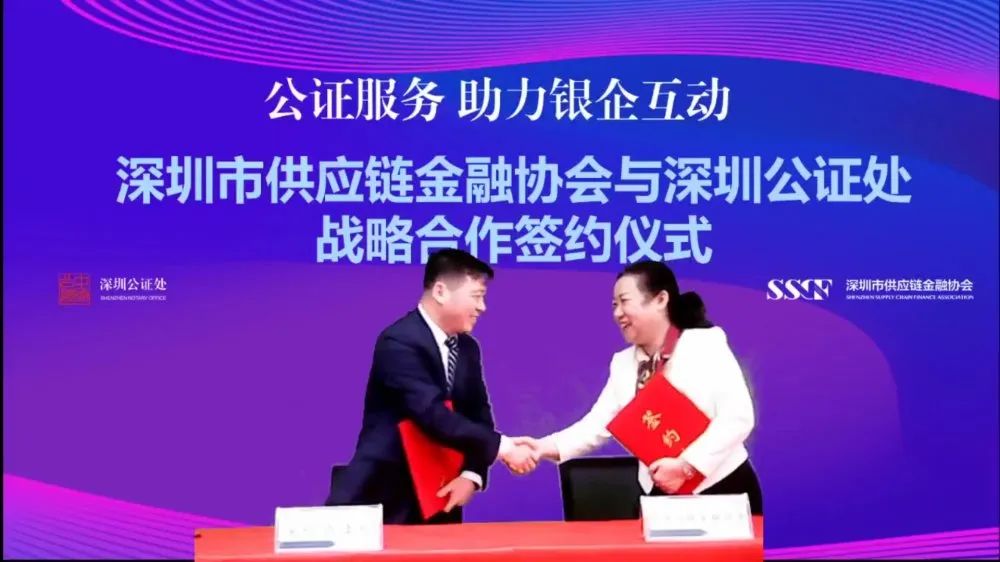2020年5月12日下午,深圳公证处与深圳市供应链金融协会成功签署战略合作协议,深圳公证处党委副书记、处副主任李金祥与深圳市供应链金融协会秘书长王淑杰分别代表签署协议。深圳公证处将建立专业团队,为供应链金融企业提供个性化、贴身化的精准法律服务支撑,以期降低企业经营成本、行业风险,为企业发展创造良好营商环境。